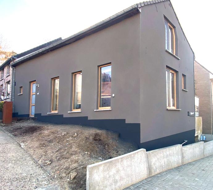 Die Vorder- und Seitenfassade wurden zunächst zementiert und anschließend mit Sprühkork in Donkey Grey veredelt. Der Sockel in Basalt Grey sorgt für ein dezentes, aber stilvolles Farbenspiel.