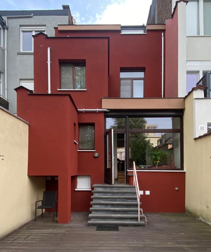 Die Rückfassade wurde isoliert und erhielt durch Sprühkork in Terrakotta ein warmes Aussehen. Eine nachhaltige Fassadenverkleidung mit einer einzigartigen Farbe.