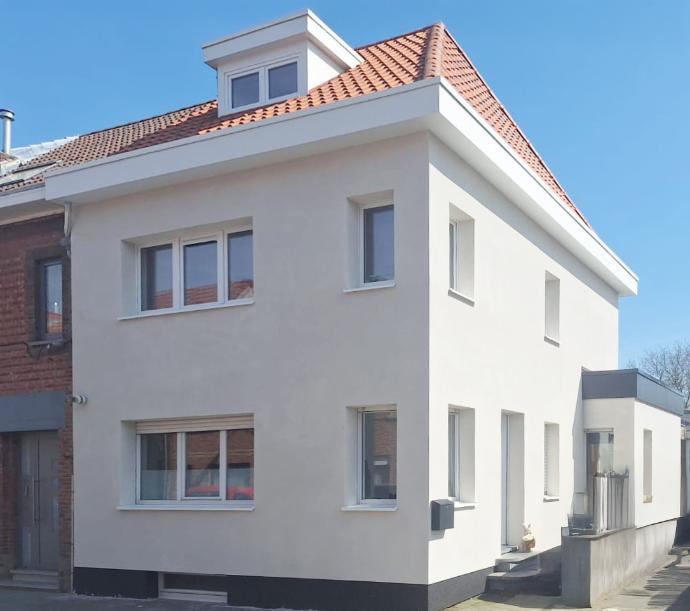 Drei Fassaden wurden mit einer 12 cm dicken Fassadendämmung versehen und mit Sprühkork in Top White veredelt. Der Natursteinputz-Sockel in Schwarz verleiht der Fassade ein modernes Aussehen.